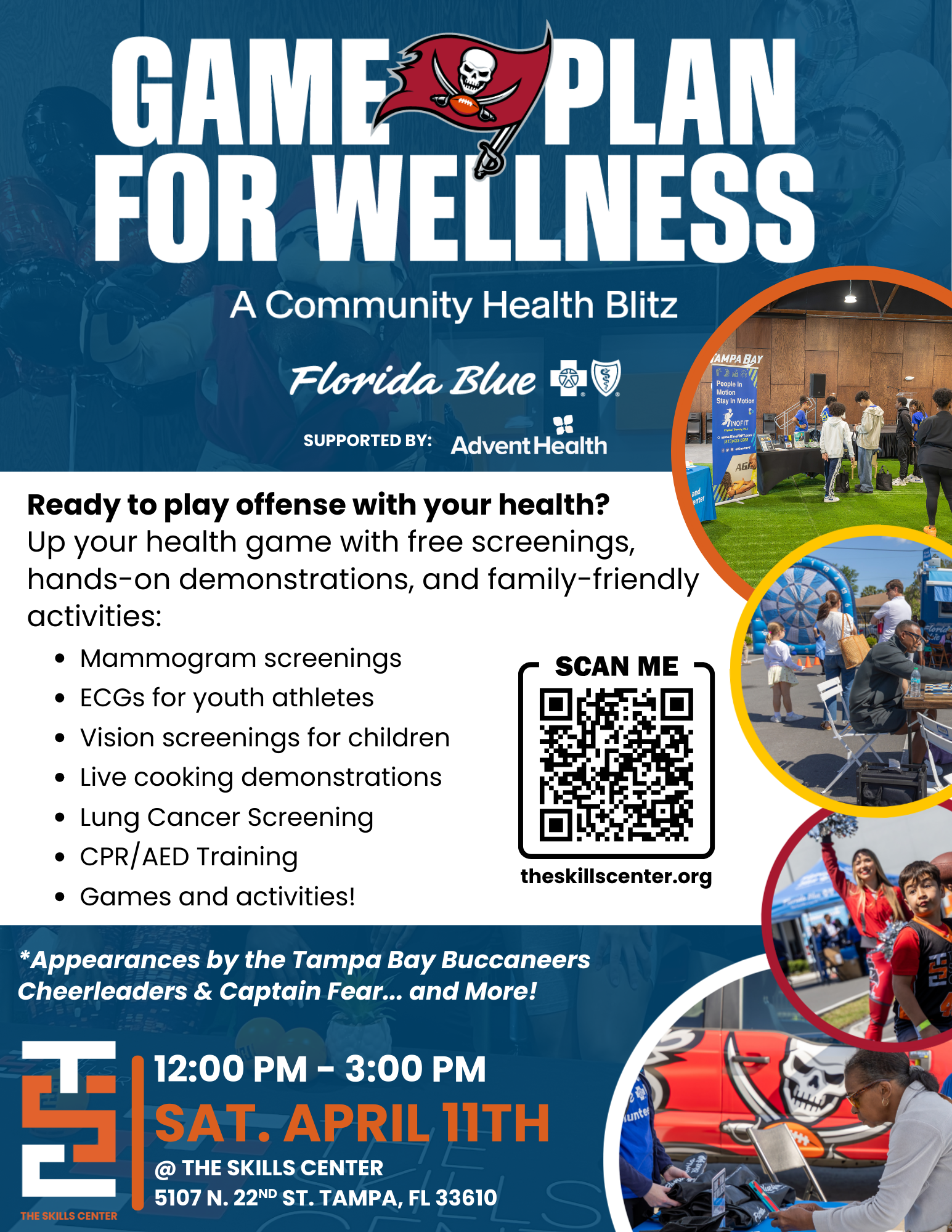 Join Florida Blue, the Tampa Bay Buccaneers, and AdventHealth, for a FREE community health fair offering a variety of services and fun. Event includes Biometric screenings, cooking demonstrations, mobile mammography exams, CPR & AED training and more!