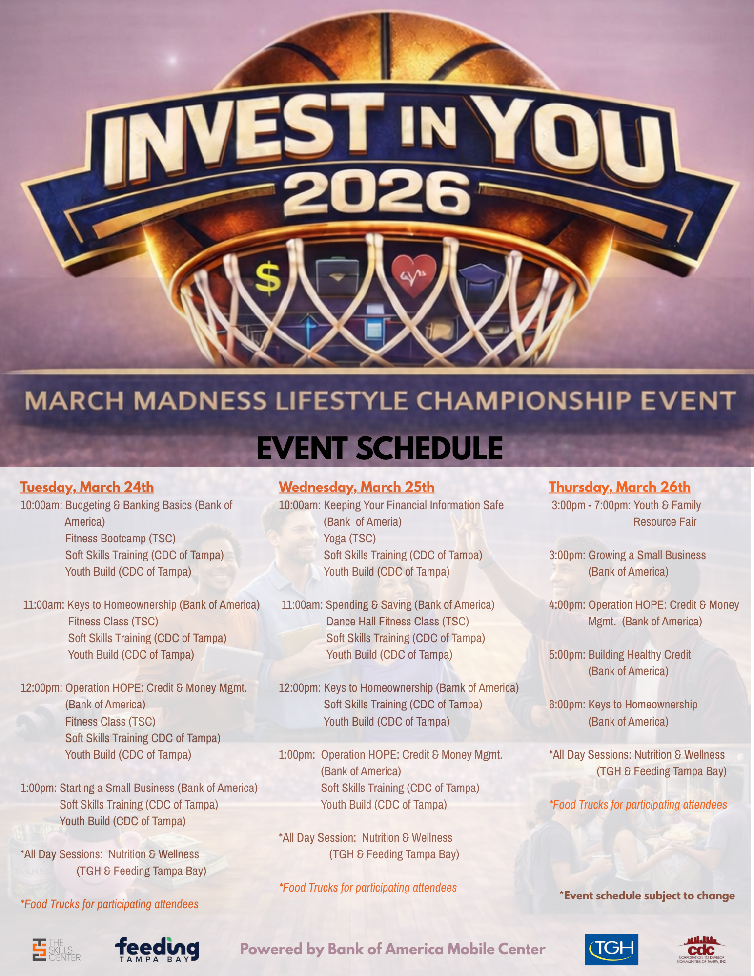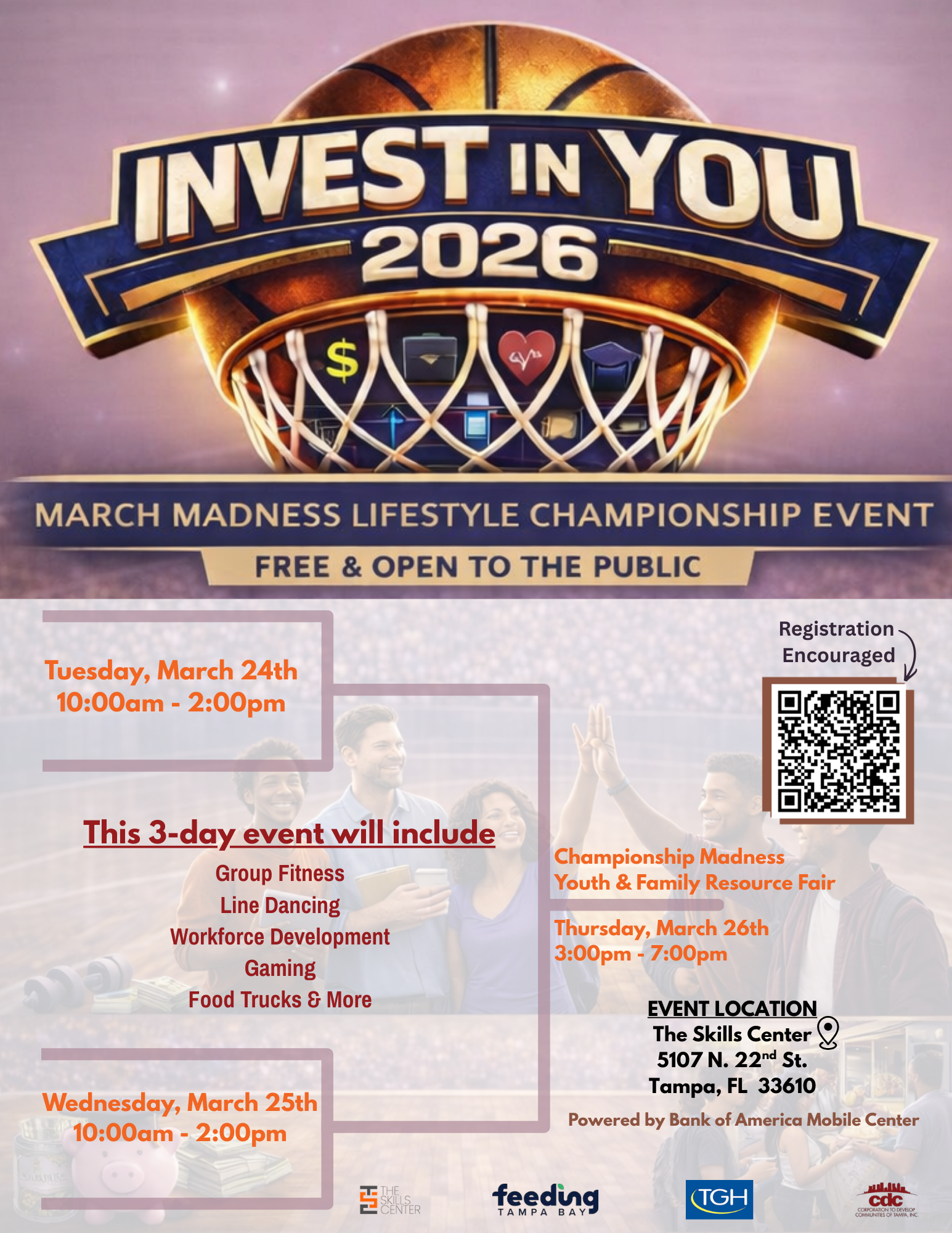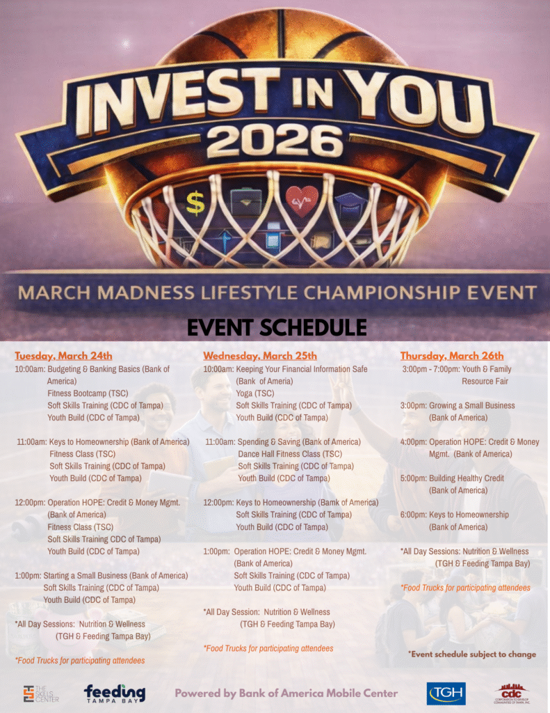 The Skills Center invites the Tampa Bay community to join us for Invest In You 2026, a three-day March Madness–inspired lifestyle event designed to empower youth and families with the tools, resources, and connections needed to build stronger, healthier, and more successful futures.